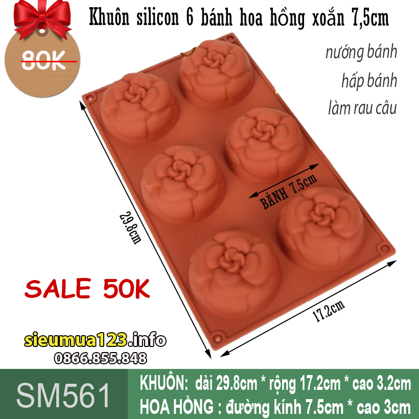 Khuôn silicon 6 bánh hoa hồng xoắn 7,5cm ( SM561 )