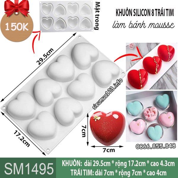 Khuôn silicon 8 trái tim bo tròn 7cm làm bánh mousse ( SM1495 )